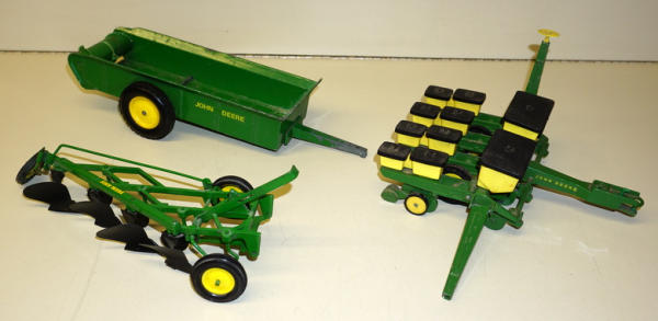Spreader, Planter & 4b Plow, plow is a poor repaint, others have heavy play wear and missing some small parts, 3x the money