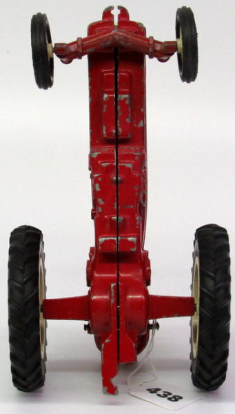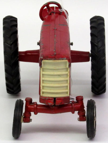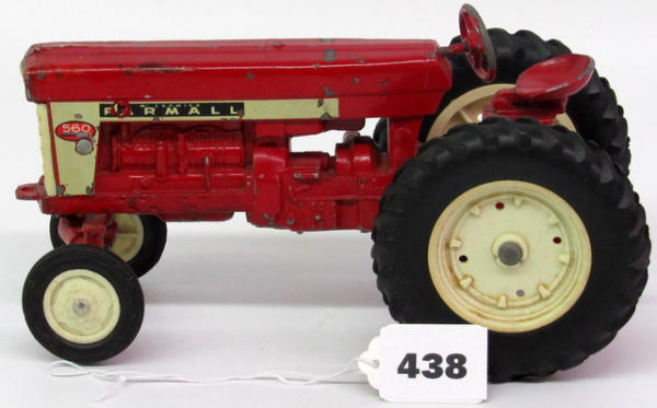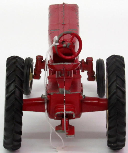 This Farmall 560 was originally a narrow front model, was split apart and the wide front axle was installed, the was the original prototype of the Toy Farmer in 1978. It has a broken hitch and many paint chips. This was used to show how a 560 could be made into a wide front version from the original narrow front.