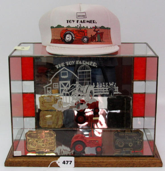 Glass show case on display at the Toy Farmer Museum for the 1985 Case 500, Gold & Pewter Buckle, Cap, and a regular production model of the 1/43 scale Case 500; Leaded Glass border at the rear and etching of the Case 500 & Barn Scene;