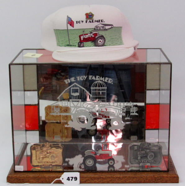Glass show case on display at the Toy Farmer Museum for the 1986 Ford 901, Gold & Pewter Buckle, Cap, and a regular production model of the 1/43 scale Case 500; Leaded Glass border at the rear and etching of the Ford 901 & Barn Scene;