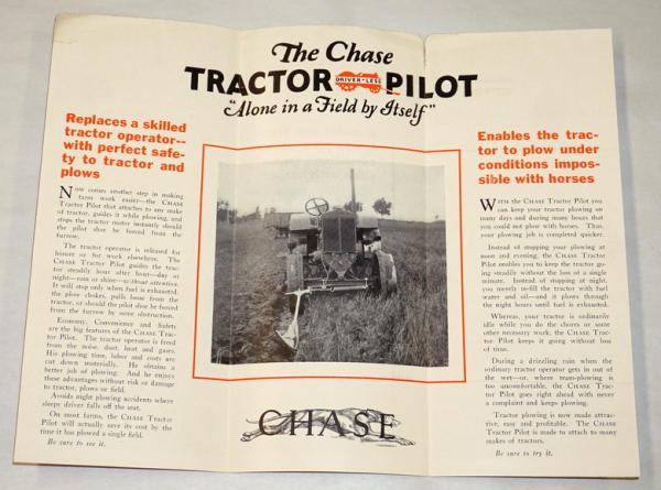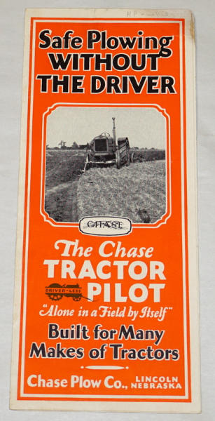 6-panel foldout, unique attachment that followed the plow furrow to steer the tractor, some wear and a small hole in the center, but overall good condition