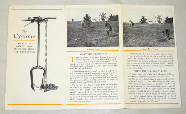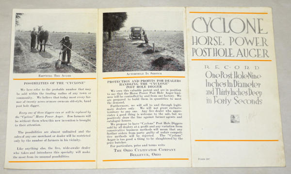 made by the Ohio Cultivator Co. of Bellevue, OH, small pocket brochure shown unfolded, looks like a horrible idea! Some general wear
