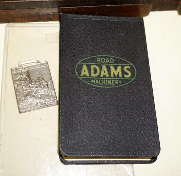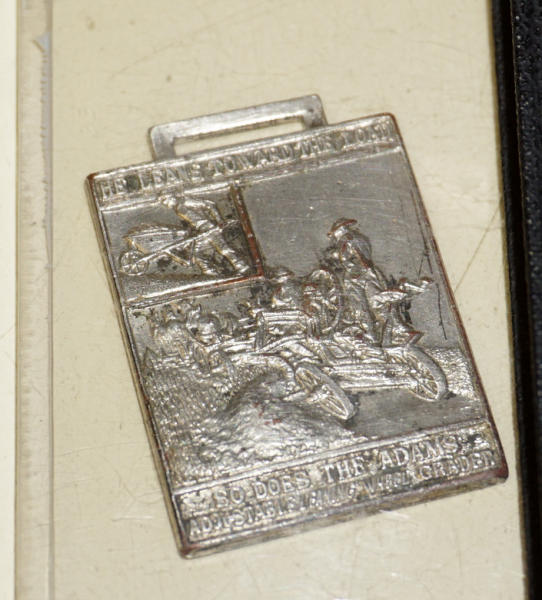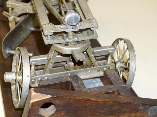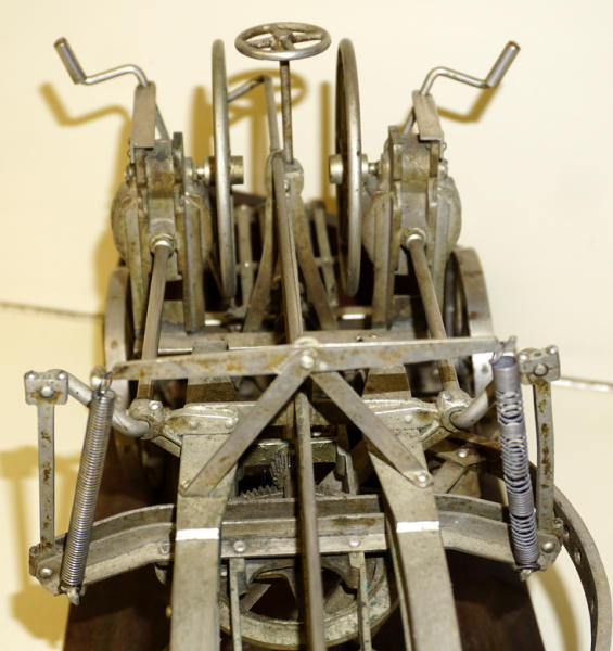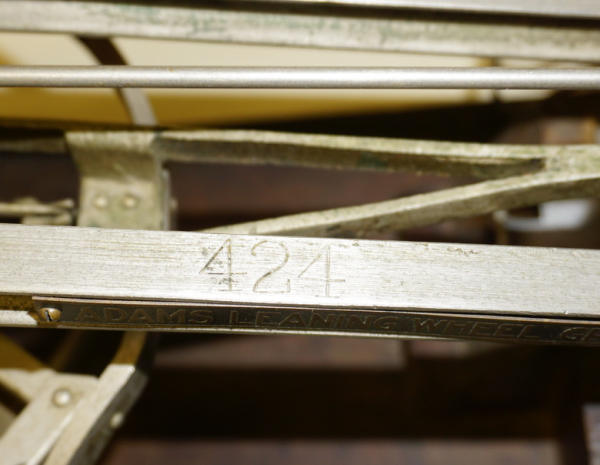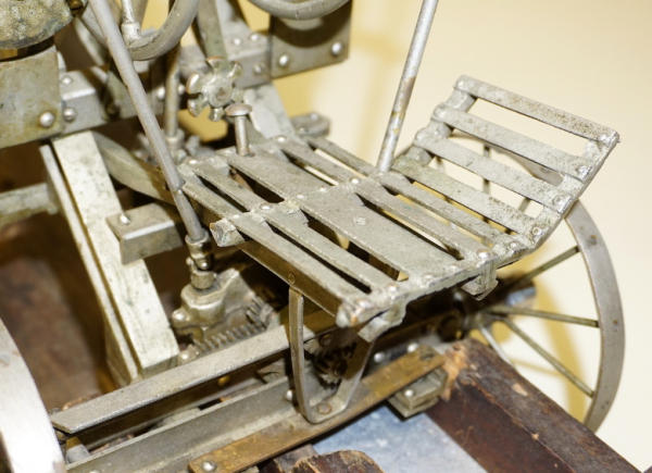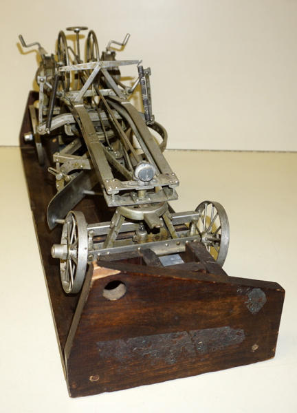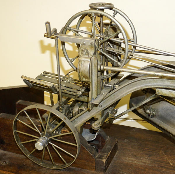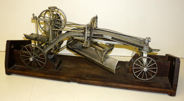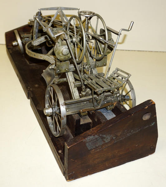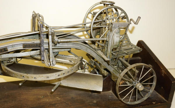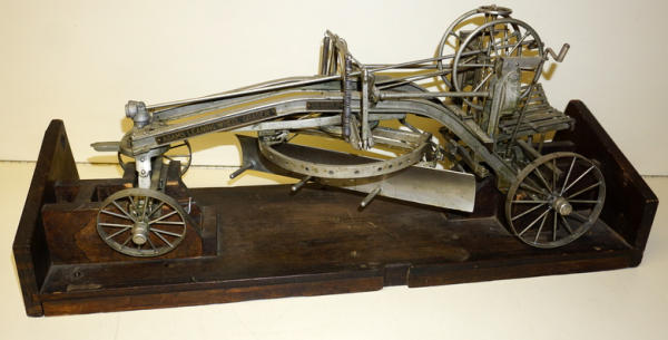Wow, first one we have ever offered through our auctions! 22" long, remarkable detail, brass name plates on the side, SN#424 stamped into the top of the frame, all the parts and pieces move like they should--just like a real one! Only damage is missing part of the platform (see photos), comes with a nice old wood stand to display and demonstrate, great original patina, I see no other damage or replaced parts; comes with an original watch fob & note book to display with it too; a featured piece for any salesman sample collector!