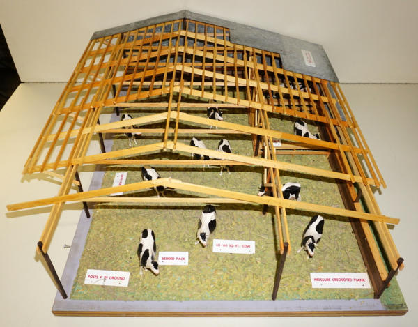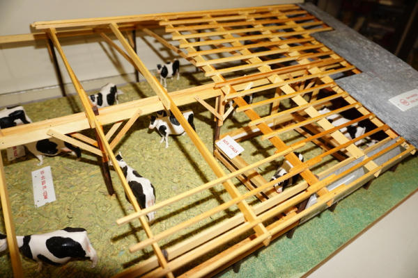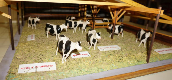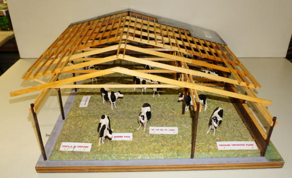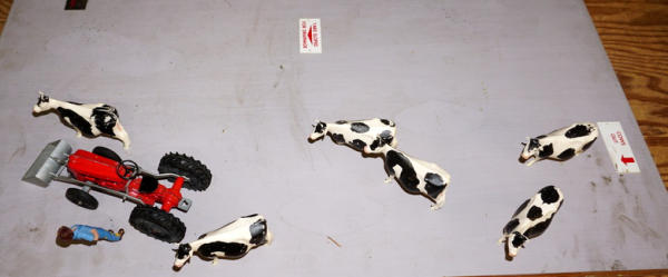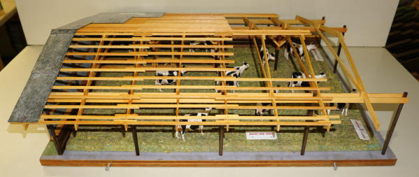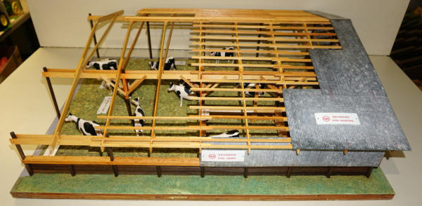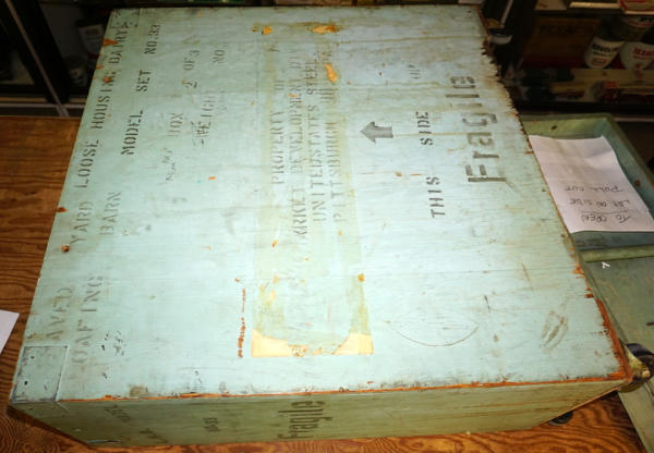 2 pieces, main piece is base is 22"x28" and about 8" tall, comes with a second board to show the yard, all in the original heavy wood carrying case with Stenciling, probably used at farm shows to sell new buildings, complete with all the cattle and the tags, I see no damage or missing parts, just a fantastic piece of farming history! no shipping, local pickup only