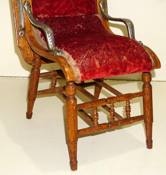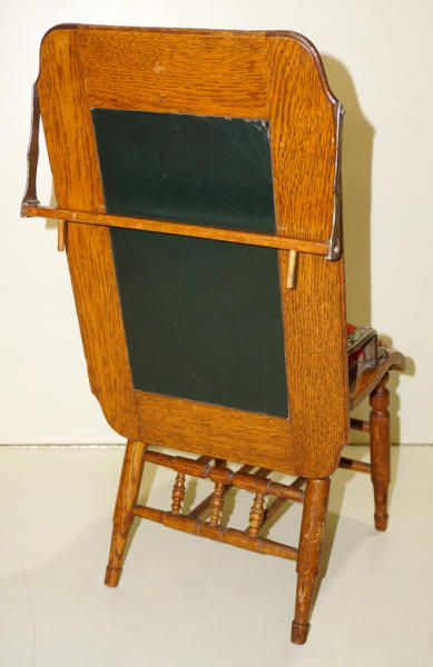 when a chair, it's about 21" tall, great original finish, carved wood, cast iron arms, original mo-hair upholstery; back of the chair flips over to make a leather top table or desk! Very cool piece