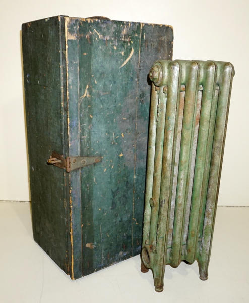 19" tall, original paint, original wood carrying case, some general wear, but a good patina overall, unique and unusual