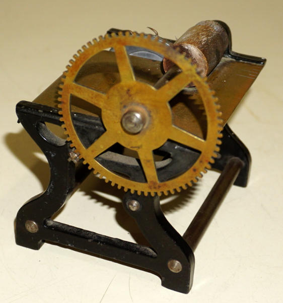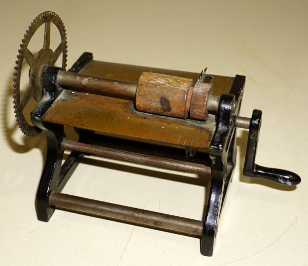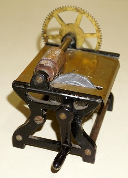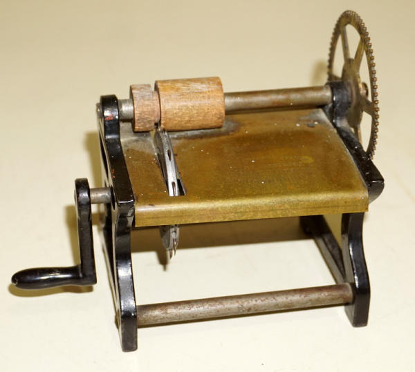 not 100% sure if this is a sample or an actual tool, hand crank, brass bed stamped "Pat 1876--WM Phillips & Co.--Providence, RI"; stands 4.5" tall, 6" wide, blade is not a saw blade, but has small spikes