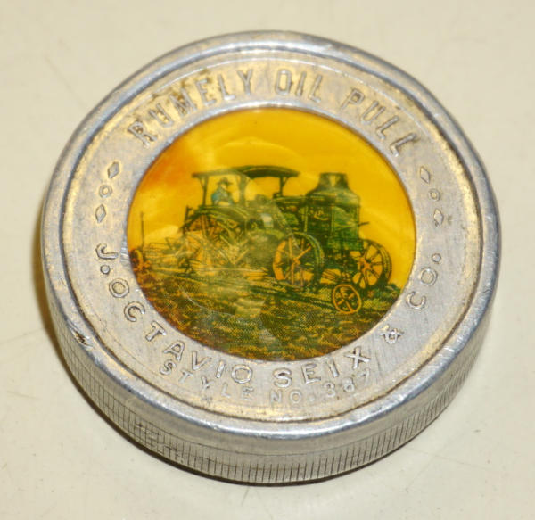 only one we have ever seen; we sold this one several years and it has came back through in a collection, 1.75" across, 1/2" thick, celluloid on both sides has some cracking and wear, but still good condition, pretty rare little piece for the Rumely collector