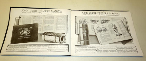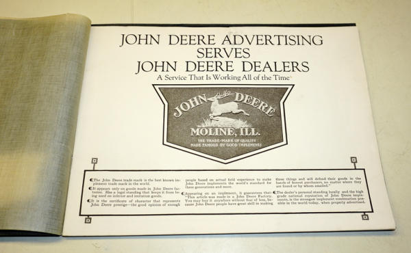 32 pages, large format, super clean and nice; full of pictures of posters, sales literature, catalogs, the rare Wood dealership rack, the $100,000 JD wood sign, watch fobs and more, super clean and nice, great piece