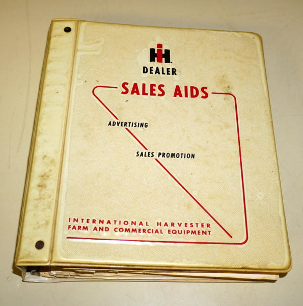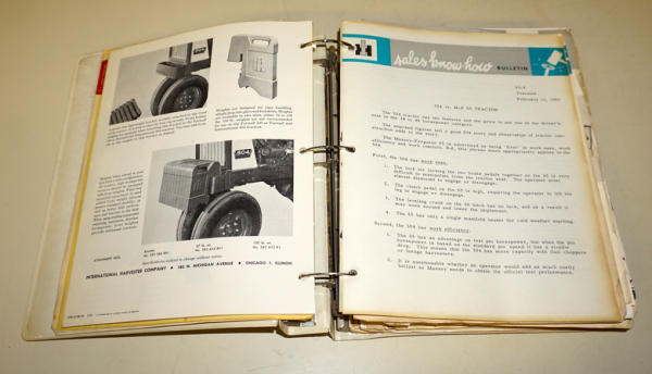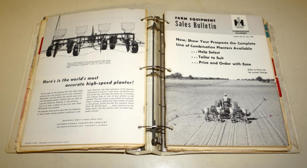 3" thick of material! Cover has some heavy wear, contents are good overall; contents don't match the cover, mostly Sales Bulletins and brochures on equipment, includes some unusual pieces like the Corn Dryer