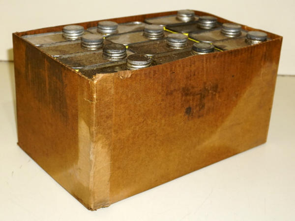 Cans are all empty, but in the original box, original box is poor, but marked for Steering fluid, cans are all good, but barn find and could use a cleaning, sells 12x the money