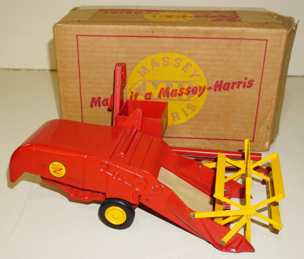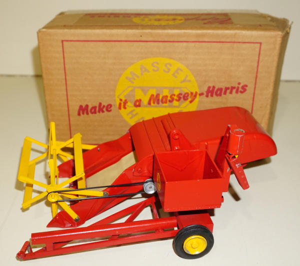 Near mint original toy, full top bar, metal rims, swinging hitch, only some slight rubbing on the top of the grain spout; box is exceptionally nice with the original insert too; best one we have ever sold