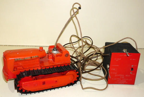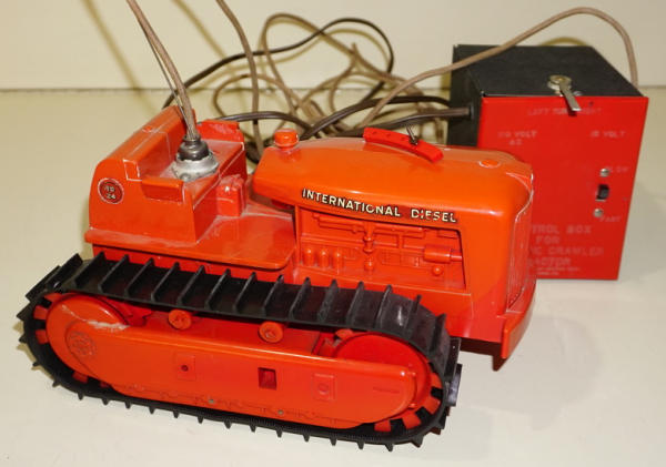 1950's Plastic toy, works like it should (Forward, Reverse, Fast-Slow & Left/Right); no blade or lights variation, plastic is discolored and drawbar is broken off the back; control box is different than most we see
