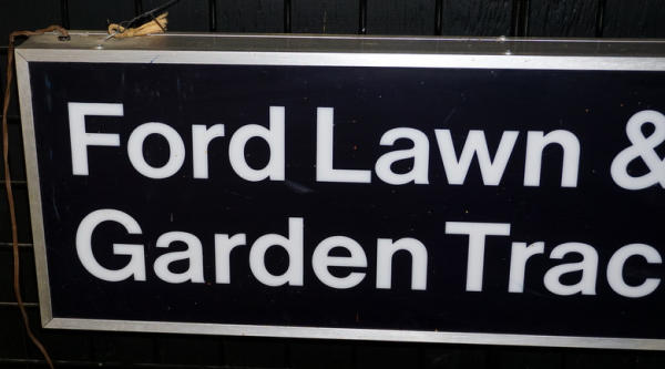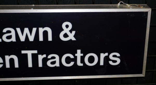 37.5"x12", plastic face in aluminum case, lights up and works, few light scuffs and scratches in the face, but overall pretty nice; hard to find Lawn & Garden advertising