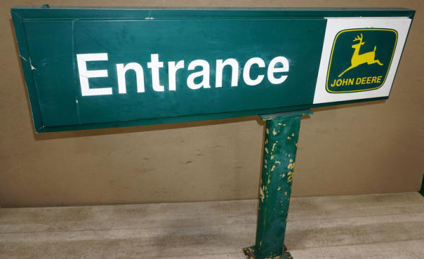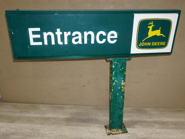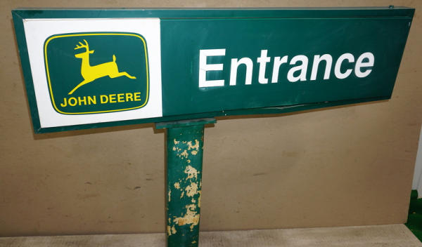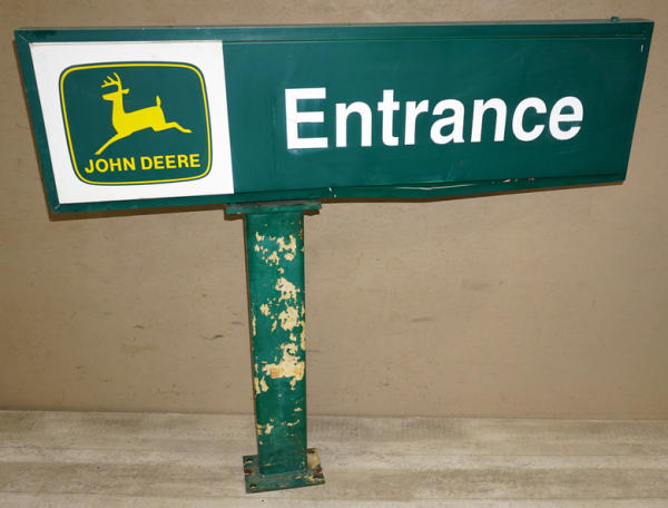 Sign 14"x50" overall plus the stand, stands 44" tall overall, both sides of the sign are good, this is the non-embossed variation; iron stand could use some new paint; this sign was sent to us from a retired JD dealer from Alabama! Frame is a little bent on the bottom side;