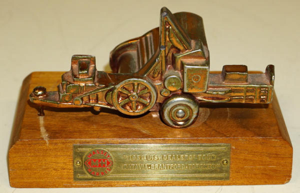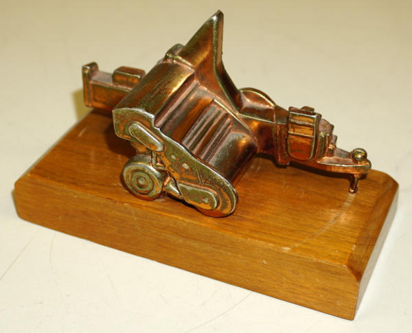 Metal baler on wood plaque, has some wear to the finish, but still nice, 5" long
