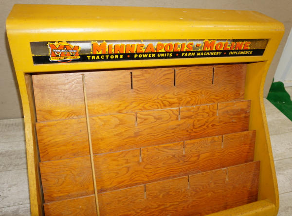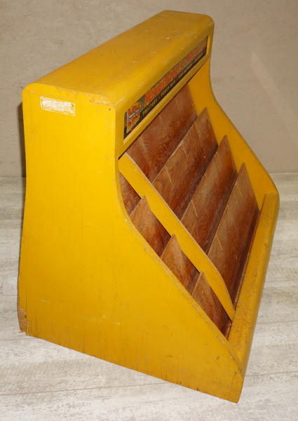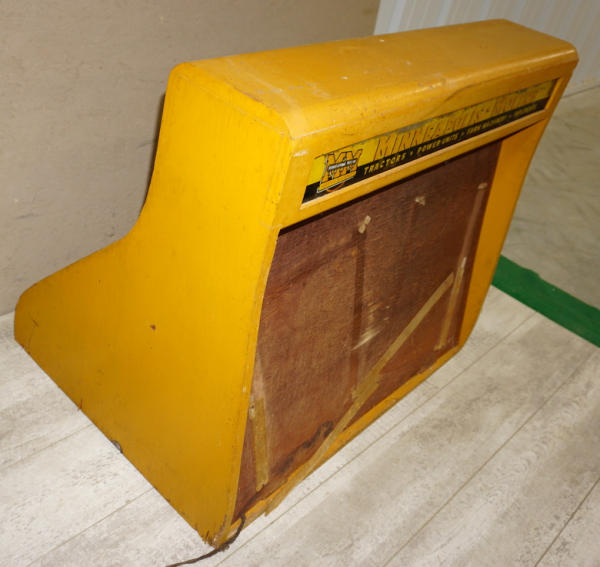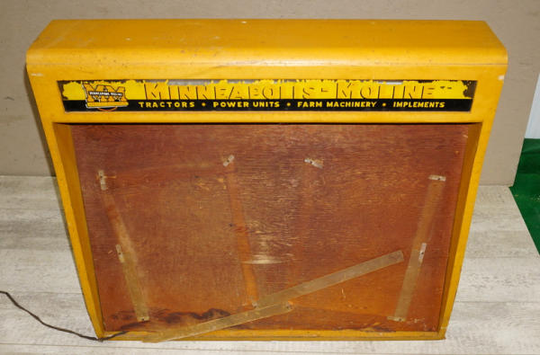 all wood, has lights inside with a double sided reverse on glass sign panels, 34" wide, 24" deep, 28" tall, overall good condition, sign panels are flaking, did not test, cord is bad, neat piece that I don't think we have ever sold before