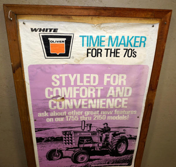 in wood frame, heavy wear, has a large puncture hole above the tractor, some water damage, not sure if the original frame, 24"x38" overall