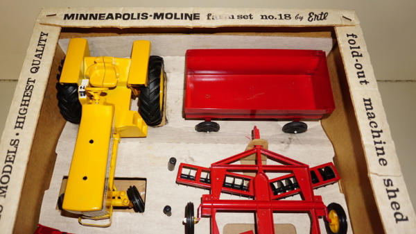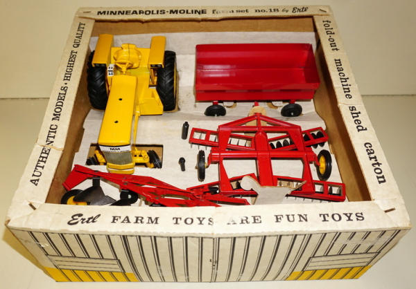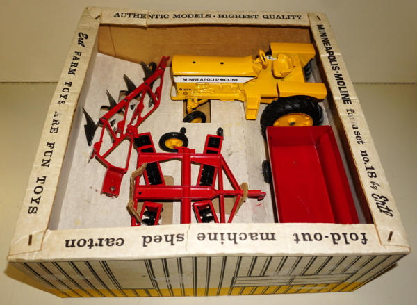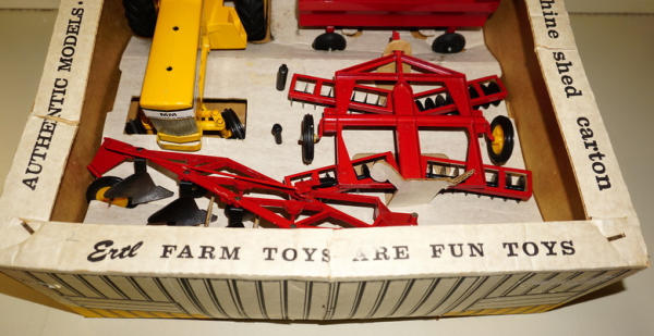 Super clean and nice set, toys are all mint with ZERO play wear; box liner is excellent and complete; outer box has some tape burn on the edges (from being wrapped as a gift!) and two small tears on the top, overall box rates 8.75 condition; a Truly rare & desirable set that rarely comes up for sale, especially in this condition! Seller told me he purchased this from a lady that got it as a birthday present in the 1960's and never played with, this is what caused the tape burn on the sides