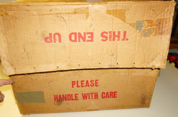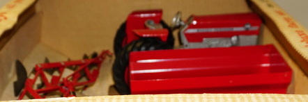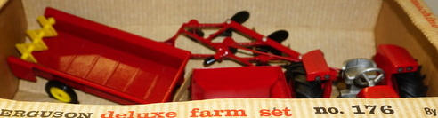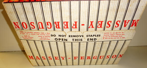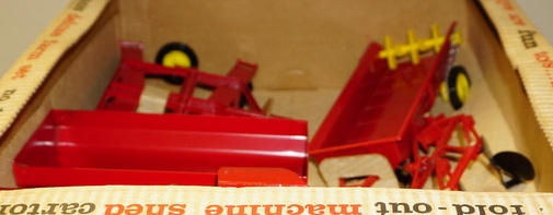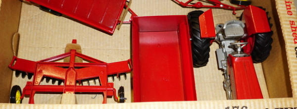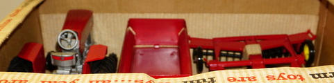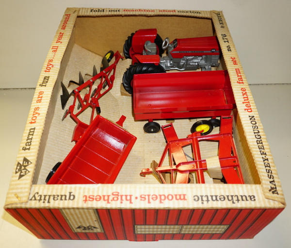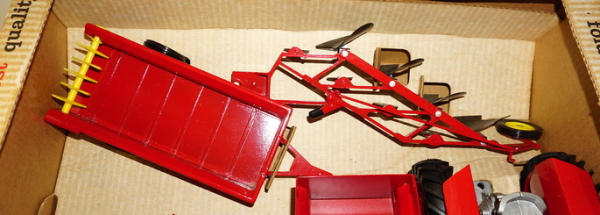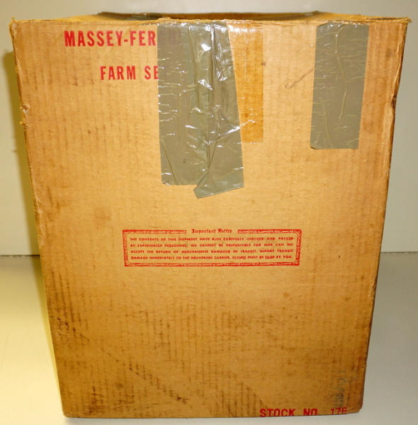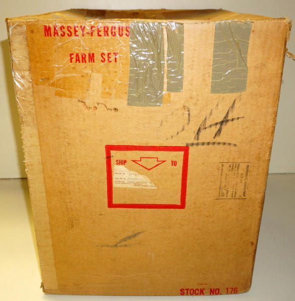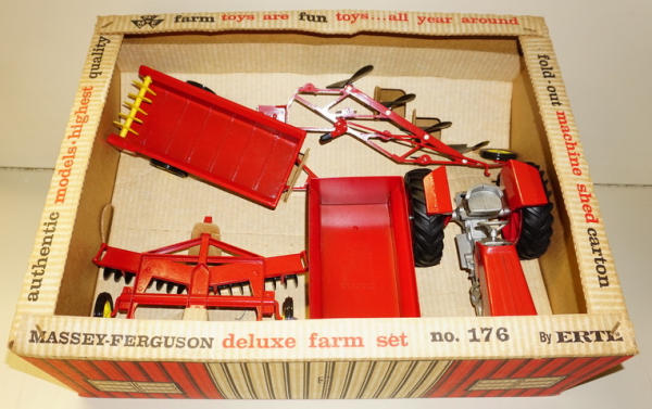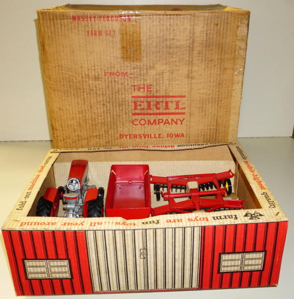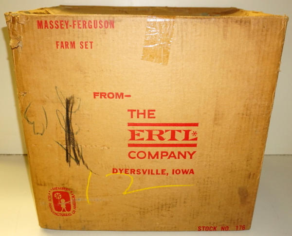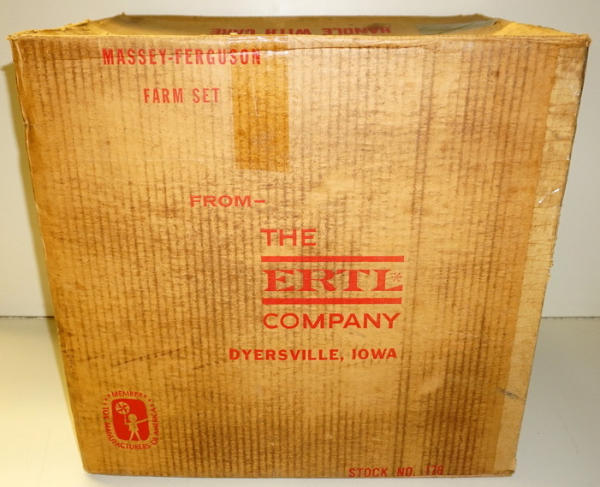Another fantastic set! Toys are all mint and unplayed with; toys have plastic wheels; box liner is good, box is discolored from age, but still very nice, box rates 8 condition; comes with the original shipping box from Ertl that would have held 3 of these sets! Box also has some discoloration and wear, but complete and probably the only one known in the world of farm toy collecting!