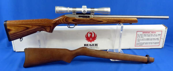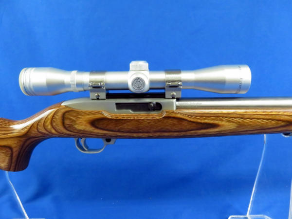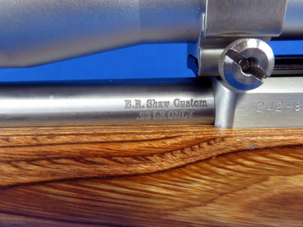 18" stainless E.R. Shaw Custom Bull Barrel; Simmons 4x32 Scope is clear; wood grain laminate stock; includes original wood stock; original box; been used but great shape; SN#242-87531