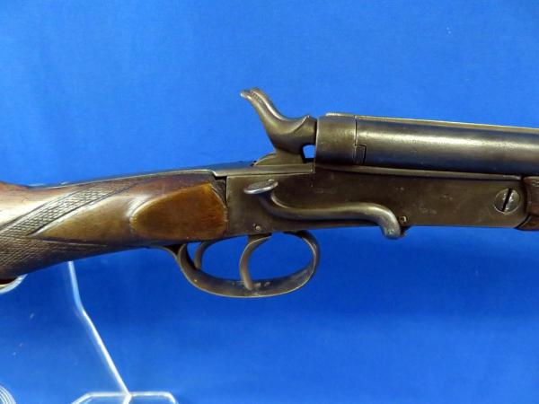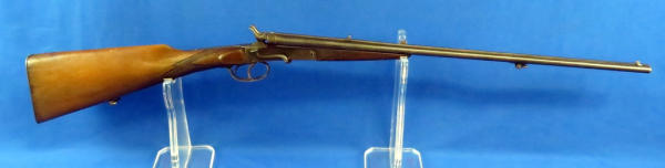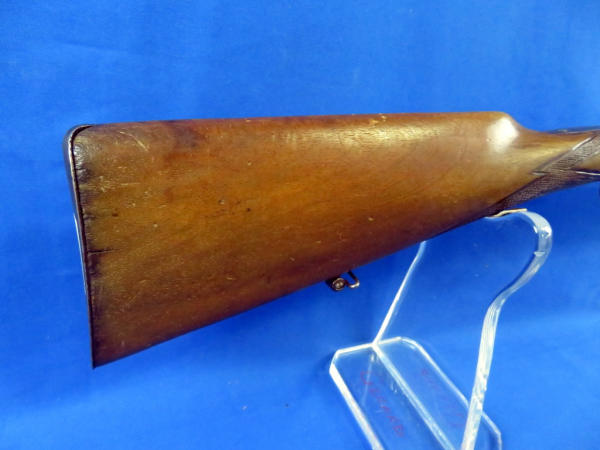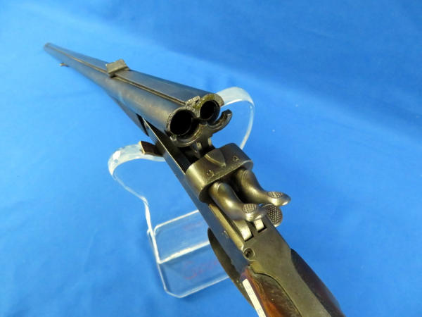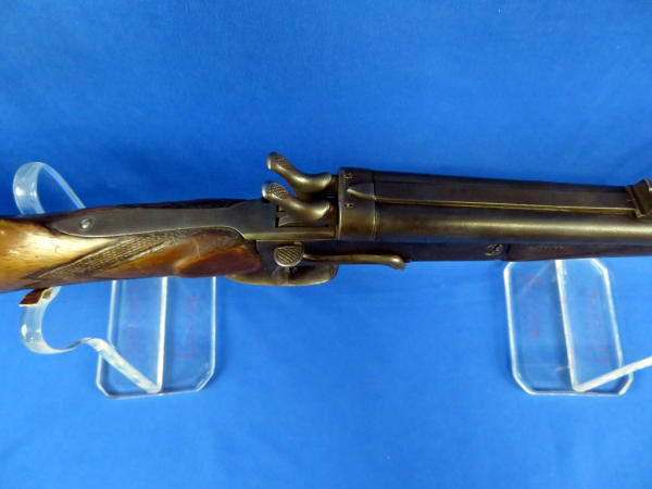 side hammer release; 23.5" barrels; wood stock w/handmade checkering; finish is thin; two triggers; neat old gun; no markings or SN# other than some proof marks; No FFL transfer required