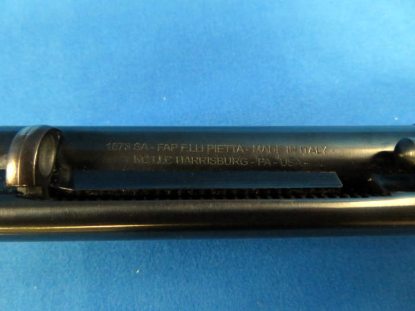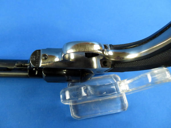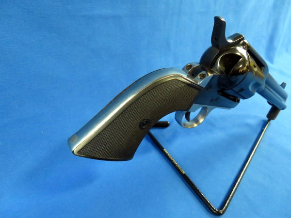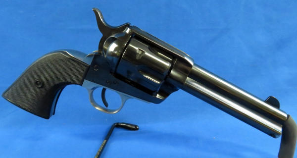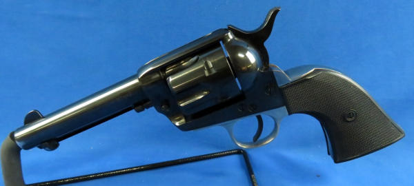 gun looks near mint & unfired; hard rubber checkered grips; nickel plated lower frame; 4.75" BBL; has a small pea size spot on left side of muzzle with bluing loss; SN#E117907