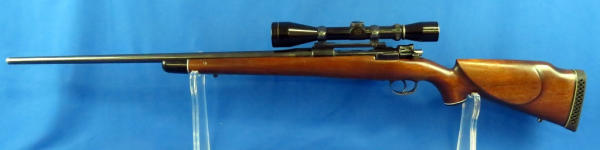 24" BBL; very smooth action; very nice condition; no maker or model that I can see or SN#; barrel is marked .257R; older Leupold 3x9 Vari-X II scope is clear;