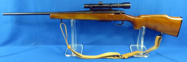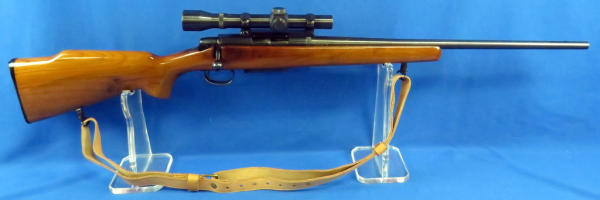 22" BBL; action is good but catches just alittle; wood is very nice; leather sling; clear Weaver scope; removable magazine; SN#020478