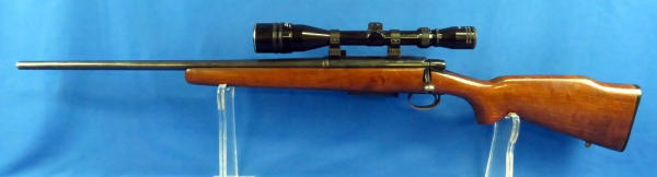 21" BBL; has left handed bolt but right side eject, must have been custom made for a lefty; Tasco 4-16x40 scope; smooth action; wood is nice w/a few field marks; removable magazine; SN#6009601