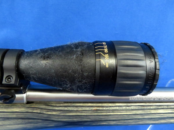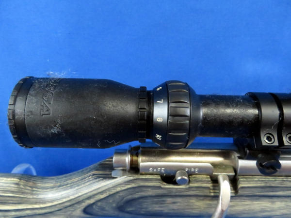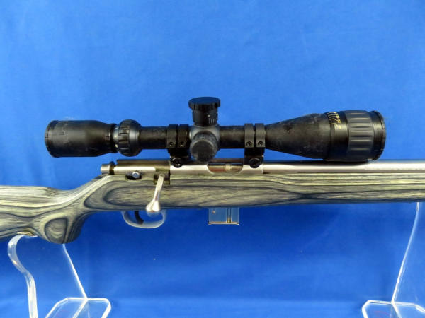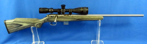 22" Stainless barrel; smooth action; removable magazine; BSA Sweet 17 scope; wood grain laminate stock; has a very sticky residue on scope; SN#96600768
