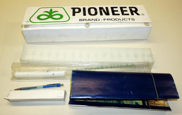 Plastic rain gauge, includes some literature and other pieces, corrugated plastic box ahs some wear