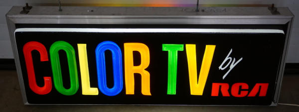 48"x19", one side is excellent, other side is nice, but has a small crack in the plastic, lights up and works, pretty neat sign with lots of great color