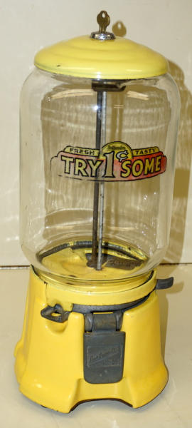 really nice original yellow porcelain coated over cast iron base and lid, original glass globe, has some chips on the top, original label is a little worn, 16" tall, has the key