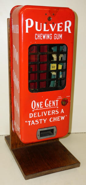 classic machine, has some touch ups in the porcelain, but not bad, 20" tall, mounted to a wood stand for display, neat piece