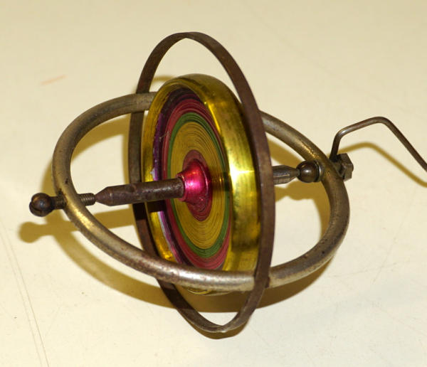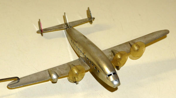 plane is 6.5" long, 8" wingspan, aluminum, missing one plastic prop, overall is about 18" long with the wire and gyroscope