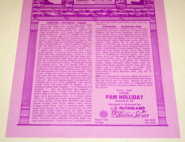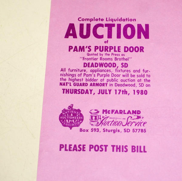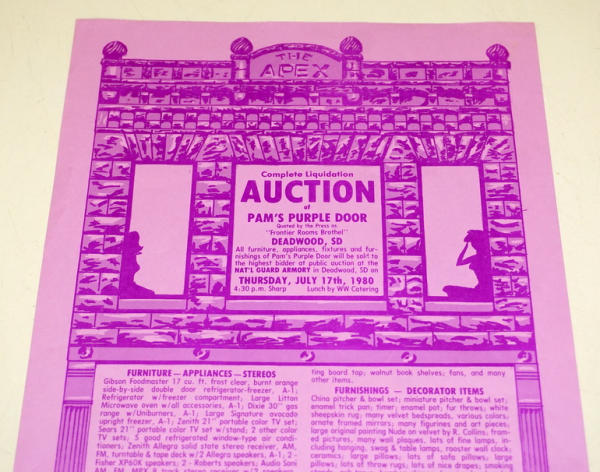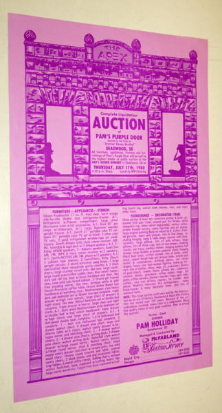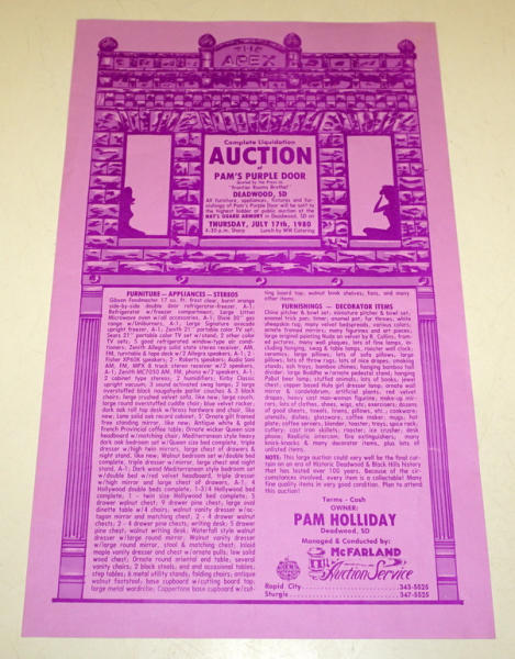 14"x8.5", clean and nice original; this was probably the most famous auction in South Dakota; Pam's Purple door was the last remaining legal Brother in South Dakota!