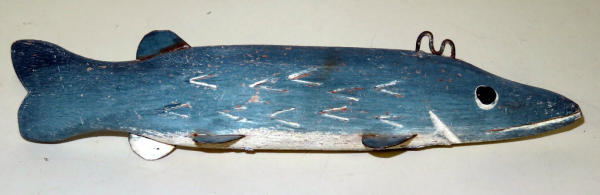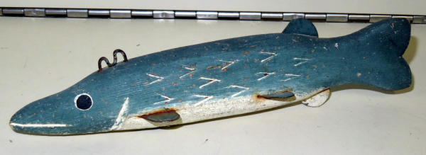 hand made of wood w/weights added to bottom; metal fins; nice look; 7.25" long