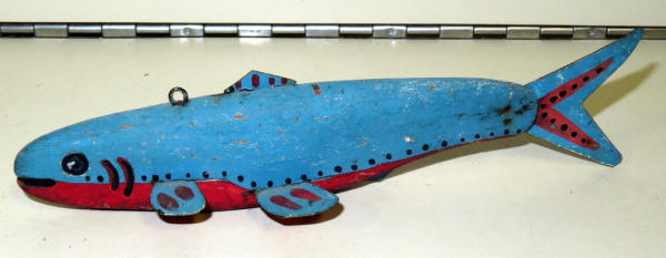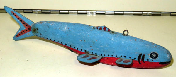 hand made of wood w/weights added to bottom; metal fins; nice look; 7" long