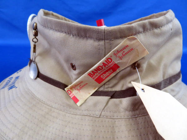 NOS; still has hang tag; has some dust staining; has band-aid, aspirin, compass, spinner & more attached; made in 1989; neat old bucket hat!