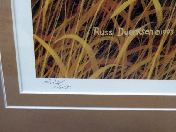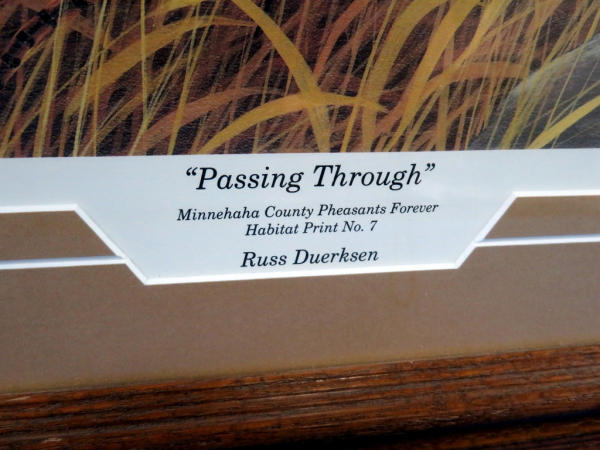 done for the Minnehaha County Pheasants Forever, Habitat Print No. 7; Signed & numbered 223/600; very nicely framed and matted; frame 27"x22"; glass front, prefer local pickup; buyer takes own risk to ship, insurance will not cover glass or print damage