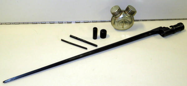 not sure what the bayonet came off of; 20" long; includes some other military firearm accessories; sell for one money