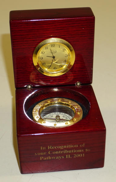box is about 3"x3"x3", opens up to show a clock & compass, mint