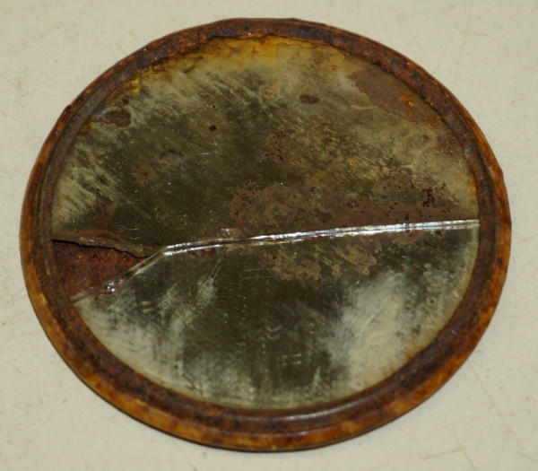 2.25" across, heavy discoloration to the celluloid and mirror is broken on the back side, still great graphics