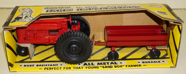 about 1/32nd scale, looks like a Farmall tractor, plastic wheels, dark red paint, toys are near mint, box is nice and clean, box rates 8.5 condition