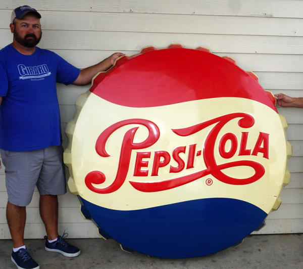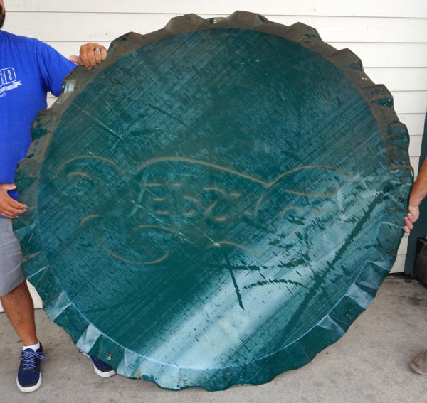 WOW, the largest bottle cap sign we have ever seen in any brand, came out of a local Pepsi distributor years ago, marked Stout, 66" across, overall really clean and nice; pickup in Fargo only--one of the highlights of the auction!