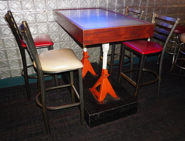Table top is 28"x48'; wood frame, Stainless teel top, real jack stands for legs w/ diamond steel base; very heavy, 2 tan stools, 2 red stools, all to go; pickup in Fargo only