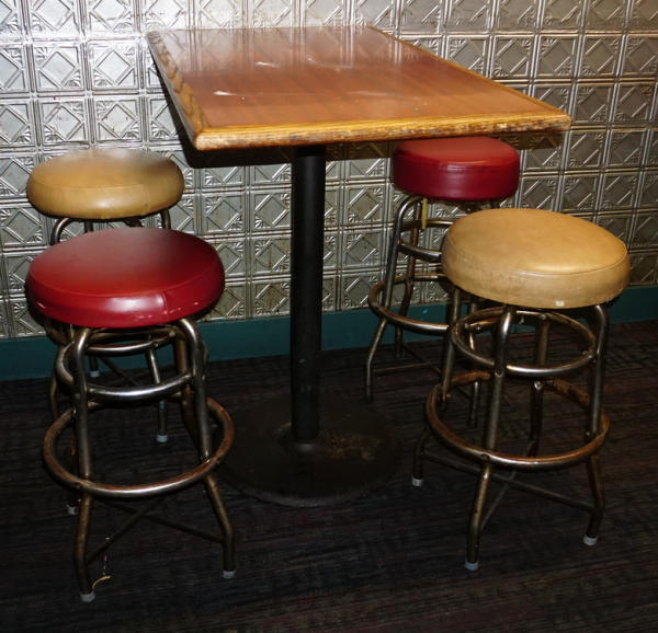 table top is 47"x26", 41" tall, older stools, all to go; pickup in Fargo only