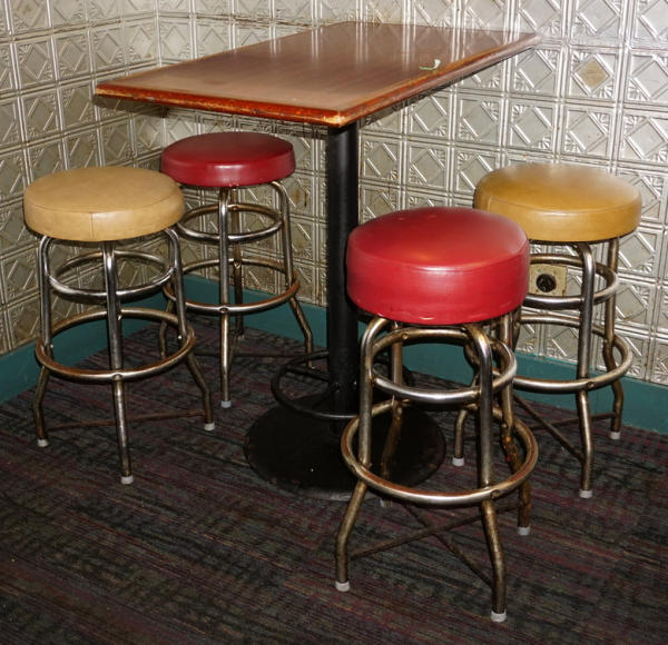 table top is 47"x26", 41" tall, older stools, all to go; pickup in Fargo only