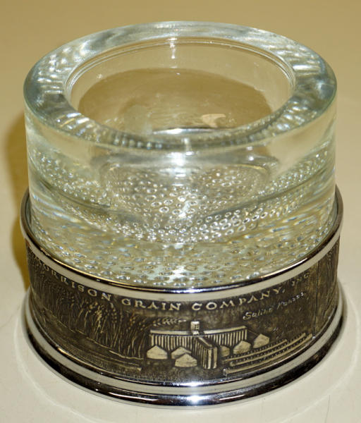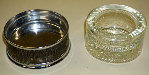heavy glass with embossed metal base, leather bottom, 4" across, neat piece